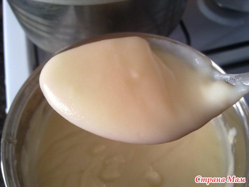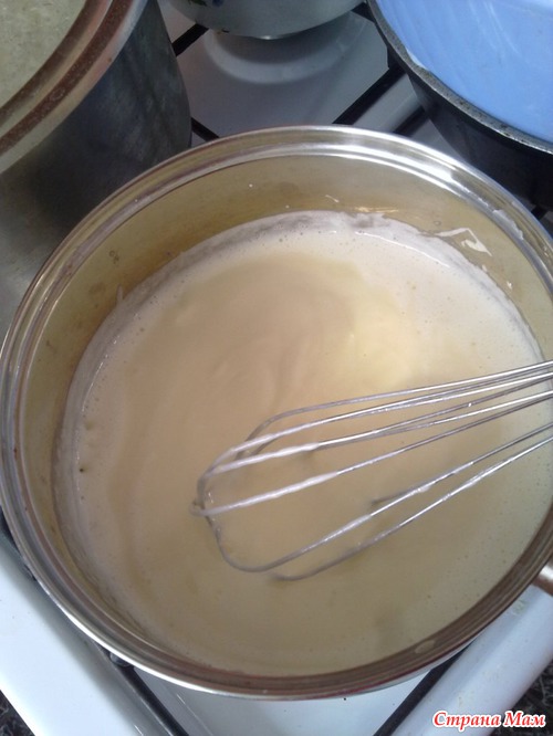 3. Яичную смесь, сгущенку вливаю в молоко и быстро размешиваю. Вся смесь стоит на маленьком огне и варится до загустения.