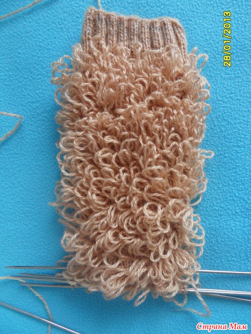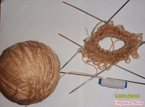 Пряжа кабардинский акрил, 5 спиц № 3, эластичная нить. Набрала по 18 п, резинка 2/2. В начало резинки ввязала эластичную нить, т. к. акрил не очень эластичен сам по себе
