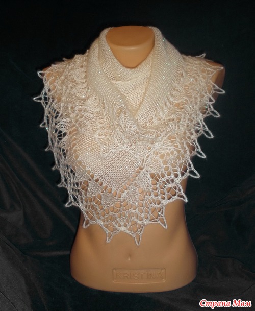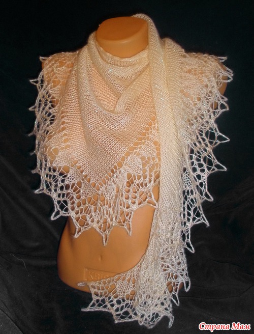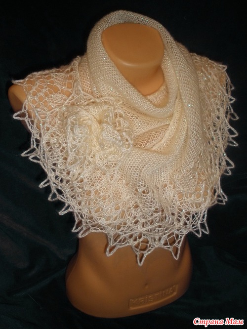 И снова фишю, снова "Lazy Katy"... Снова Alize Angora Gold simli (с люрексом) 100г/500м, использовала около половины мотка. Спицы №4, крючок № 4 (для закрытия петель). Цвет пряжи молочный, скорее цвет сгущенки, люрекс блестит то ли зеленым, то ли синим.