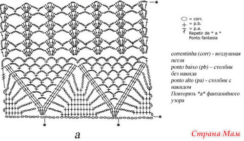 Набрать около 300 воздушных петель, замкнуть в круг. Работать по схеме фантазийного узора, на 300 воз. петель получается 10 узоров (на схеме обозначен один узор *а*).