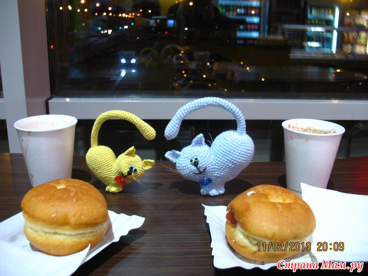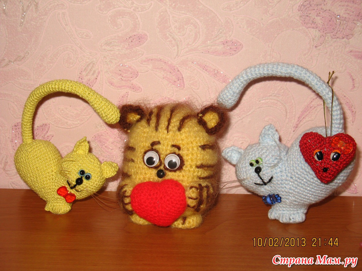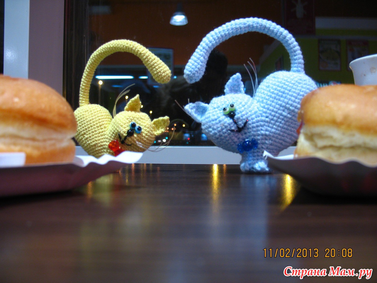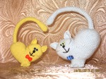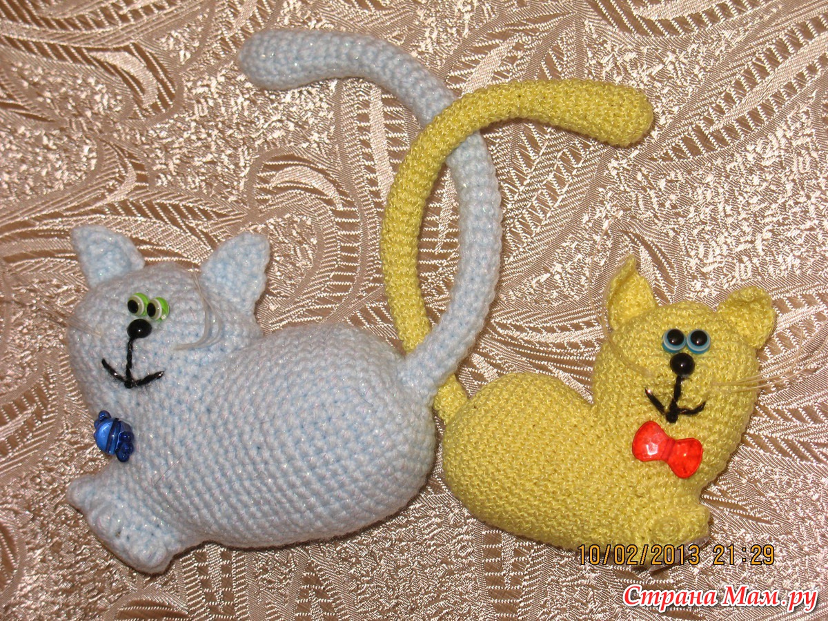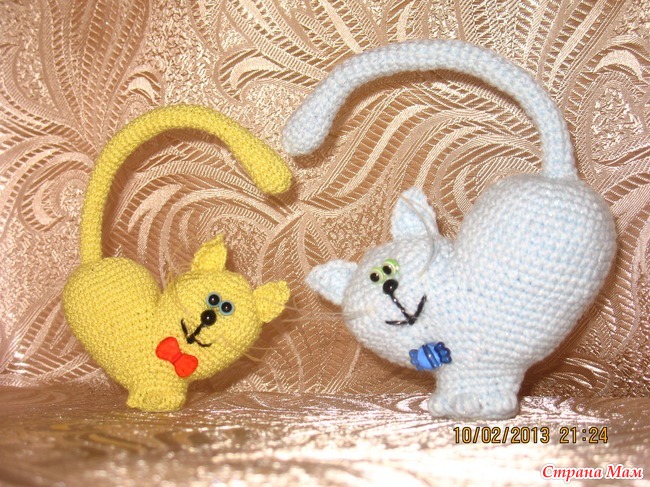 Славные кошарики, похоже это самый популярный проект на этой неделе. Я тоже не устояла и связала, только усами не удовлетворена. Подскажите, пожалуйста, из чего у ваших кисок.