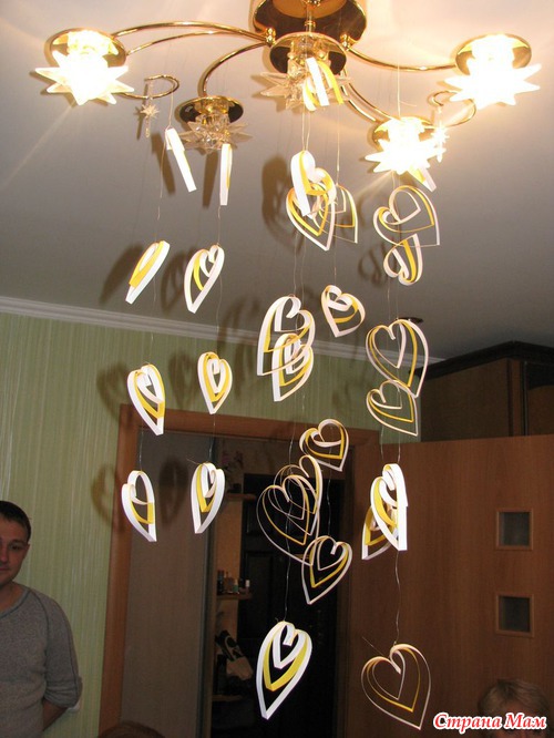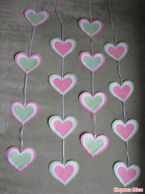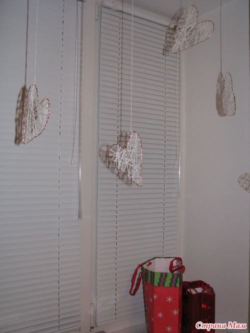 Идея №1: декоративная штора (сердечки из ватмана прострочены на швейной машинке, одного ватмана хватило!)