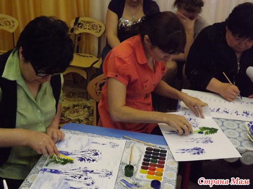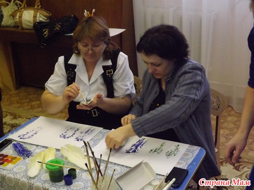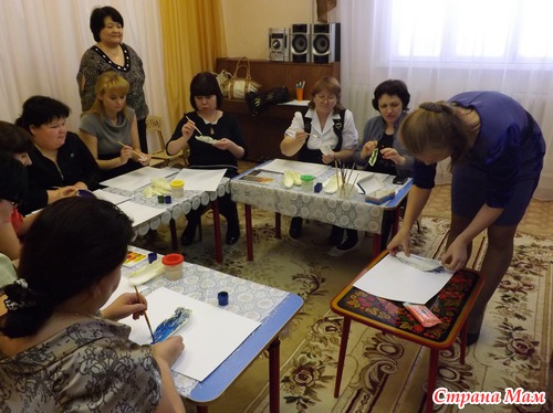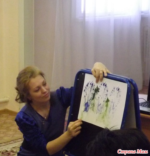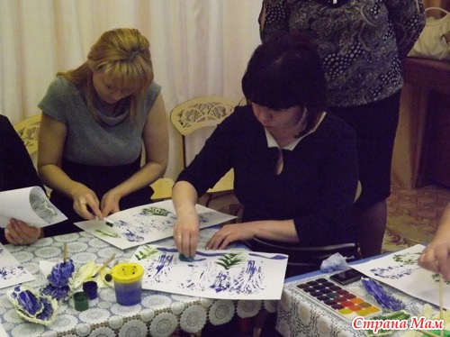 Здравствуйте уважаемые коллеги! Провела на базе своего сада мастер-класс по Изо деятельности, были приглашены интересующиеся рисованием педагоги других детских садов. Показала презентацию детских работ и грамот, поделилась своим опытом работы. На мастер- классе рисовали капустным листом и зубной щеткой. Для детей советую тонизировать лист бумаги, после, рисовать белой гуашью.