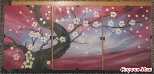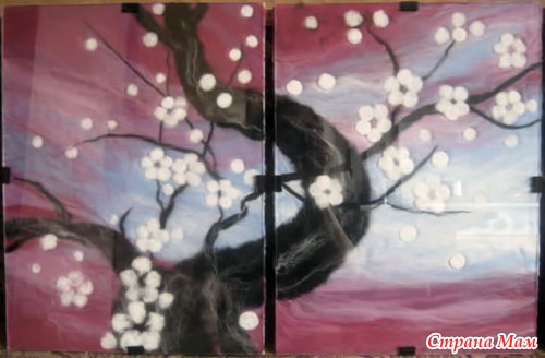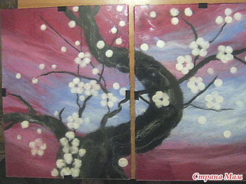 Когда-то раньше, еще до замужества, очень увлекалась рисованием. Потом, как обычно это бывает, быт, ребенок затянуло все. Но в сентябре мы пошли в садик!!! И тут началось... Меня понесло в разные стороны. Делала ковры с длинным ворсом, вязала пледы, свитера, шали... в общем мамочка дорвалась))))) А недавно обнаружила для себя такой материал как нечесаная шерсть. Сначала были игрушки, но... но когда я увидела что ею можно еще и рисовать, восторгу моему не было предела))))) пока собрала все детали для картины и начала делать, думала меня удар хватит (не все сразу удалось найти). Но зато потом на три дня меня не было не слышно не видно)))) Вот, выкладываю результаты творческих усилий, жаль, что фотограф из меня не очень, да и техника не с супер объективами, поэтому по несколько вариантов фото (дневное и с лампой) там где светлее и нежнее тона более соответствует действительности. Картина представляет собой триптих. Размеры: вся целиком 90*40 см, каждый кусочек 30*40 см.