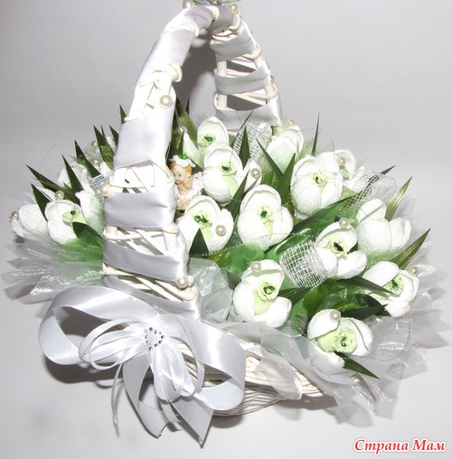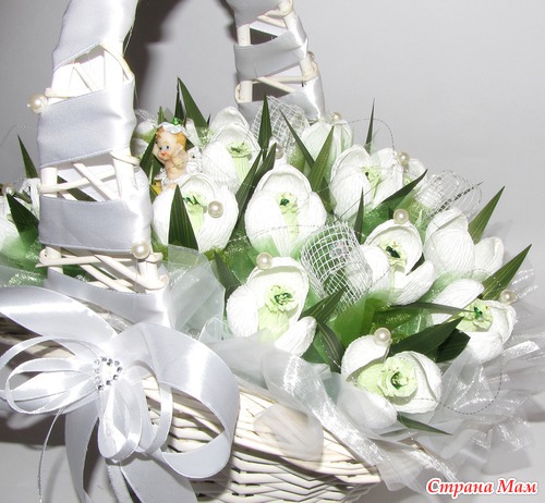 Хорошо!))) Лепесточки и серединки подснежника из креп бумаги (гофрированная бумага), конфеты (я брала Фундук в шоколаде) или можно любые круглые, но желательно маленькие конфетки, листики из аспидистры, но можно заменить креп бумагой...
