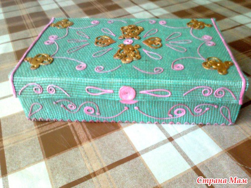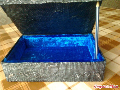 Эта шкатулка изготовлена из картонной коробки. Имитация металла. Внутри отделана бархатом.