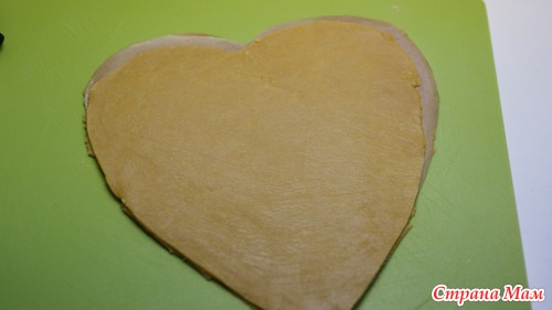 Потом посыпьте стол мукой, разделите тесто на 6 частей (или 7-8, как сможете раскатать), я сделала в форме сердца. Выстелите противень пергаментной бумагой и выпекайте на нём коржи в духовке при 200 градусах.