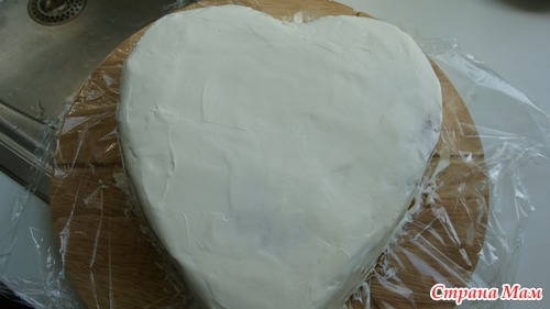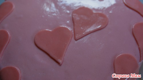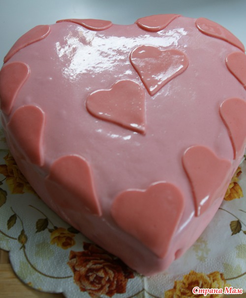 Можно измельчить обрезки коржей и посыпьте ими торт. А я покрыла мастикой из Marshmallow и украсила в стилистике Дня Валентина.
