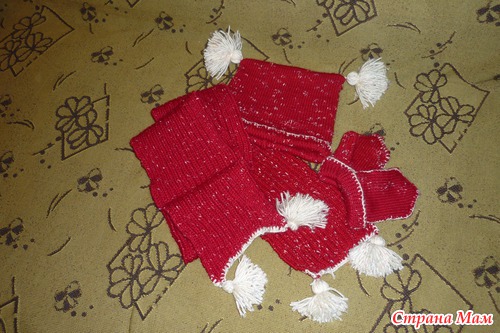 Шарф связан английской резинкой, а варежки и шапка - двойной, или полой, резинкой.