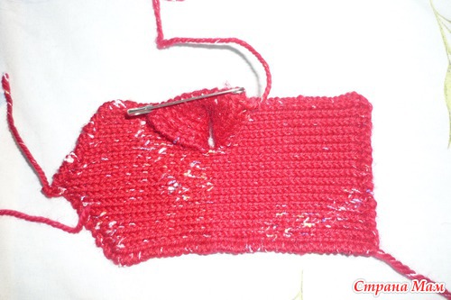 Когда его высота достигнет длины большого пальца, обрываем нить, оставив конец длиной около 20 см для сшивания пальца, а все петли большого пальца пока оставляем на булавке.