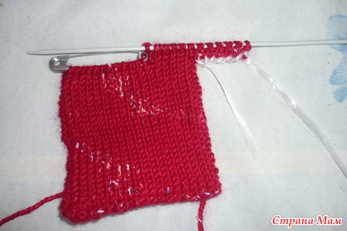 Вязать ладошку немного сложнее, так как надо вывязать большой палец. Начинаем вязать ладошку снизу вверх, так же как и тыльную сторону варежки. Дойдя до основания большого пальца, делим все петли на четыре части. Три четверти петель оставляем на булавке, а одну четверть петель надеваем на спицу так, чтобы рабочая нитка, которой мы вяжем, оказалась со стороны острия спицы. На вторую спицу набераем такое же количество новых петель вспомогательной ниткой другого цвета. Но вязать эти новые петли будем нашей рабочей нитью вместе с четвертью старых.