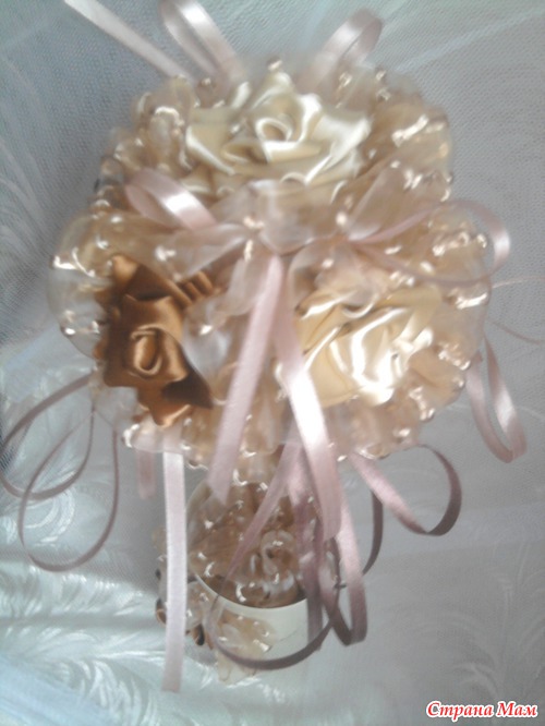 А получилось оно краеугольным (слишком большая основа цветков по отношению к шару) и кособоким (где-то цветки сильно прижала при приклеивании, где-то пожалела). Решила ленточками подправить
