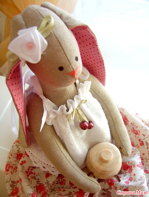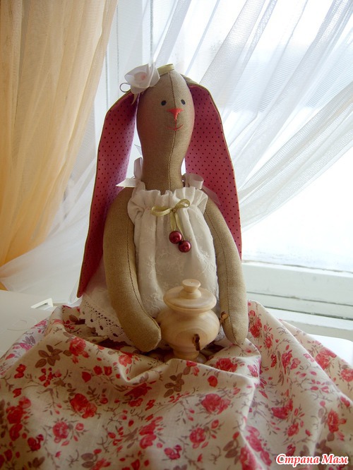 Что можно еще рассказать про Заюшку! Как я и говорила, чистюля невозможная! Потому для нее сшила полностью съемную одежду. Блузочка и юбочка у нее из тонкого и нежного батиста, все это при необходимости снимается, стирается и гладится. Саму Заю тоже можно искупать, но только вручную! Да, и уши потом не забудьте поладить! Еще она любительница чая с вишневым вареньем! Потому приедет к вам со своим главным приданным - самоваром! Ростом она 52 см. Цена 950 рублей (плюс пересылка по России 200)