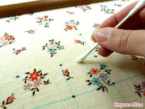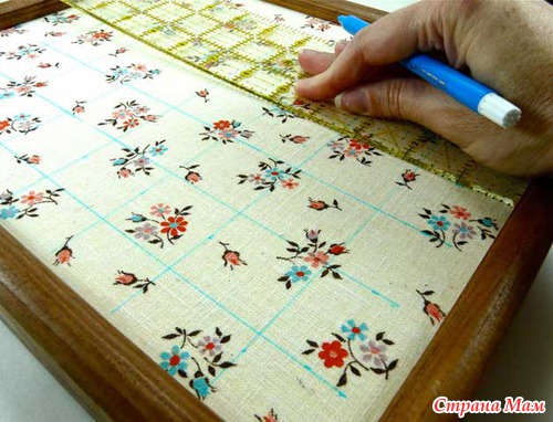 Вставьте лист с тканью в фоторамку, разграфите его на квадраты, таким образом, чтоб на пересечении линии можно было поставить пуговицу и она не касалась соседней пуговицы на соседнем пересечении линий.