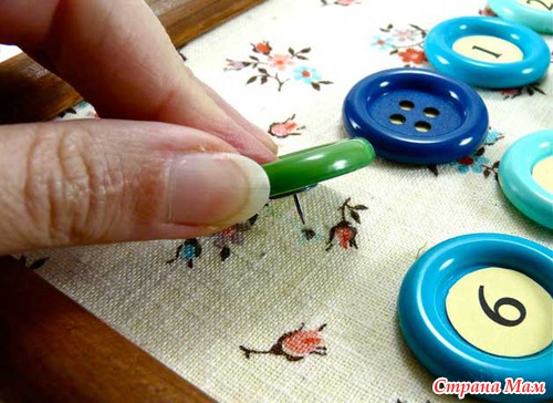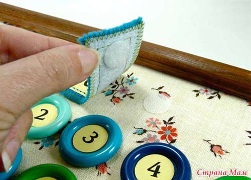 Приклейте пуговицы с числами к материи в местах отмеченым карандашом.