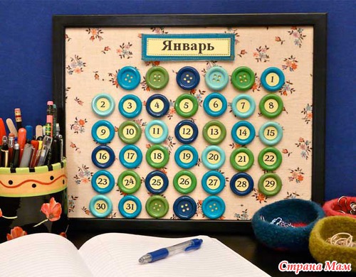 Распечатайте от 1 до 31 числа. Вырежьте их кружками и приклейте эти кружки на пуговицы с помощью клея, а другую сторону приклеить кнопки.