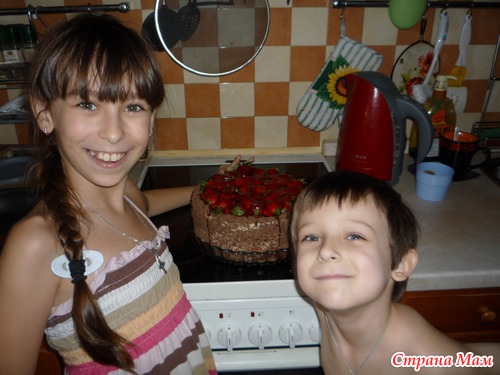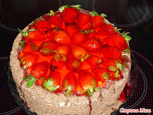 Украсила простенько, бока: тертый шоколад, верх: клубника, залитая желе для торта. Заморачиваться не стала.