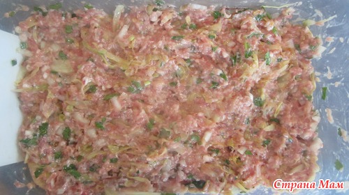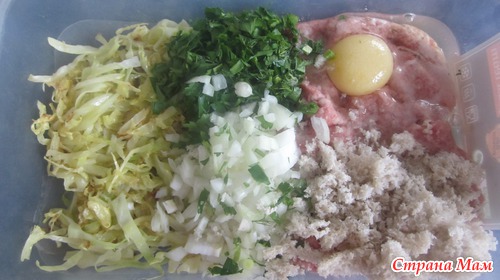 Смешала фарш+яйцо+зелень+лук+мякиш+капусту