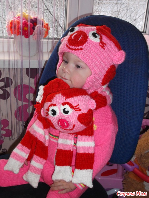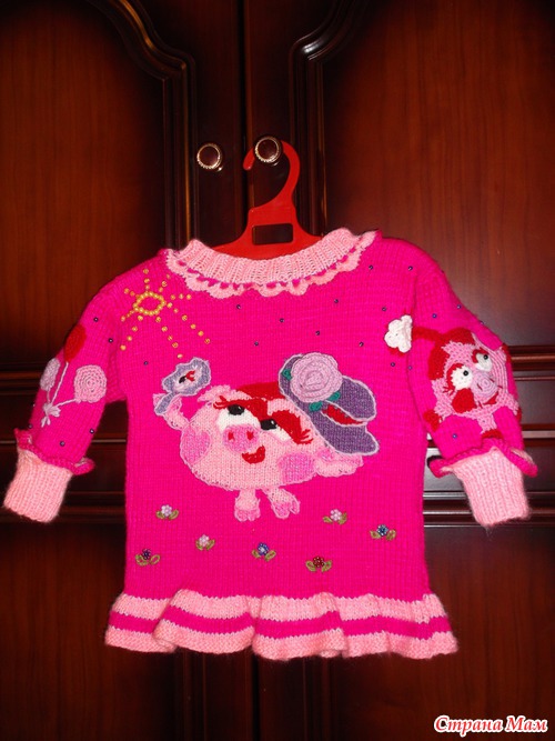 В комплект входят : пуловерчик, штанишки, шапка и шарф. Еще один пуловерчик придумала, но не на заказ, а для младшей дочурки. Картинки из мультфильмов взяла, разчертила на клеточки ( на нужное количество петелек- у меня получилось на 50 петель) и вывязывала рисунок. Потом весь рисунок вышиваем по контуру. Украсила вышивкой из атласных лент и бисером. На шляпку Нюше связала крючком розочку. На рукава связала отдельно и потом пришила Нюшу и Шарики, украсила бисером.