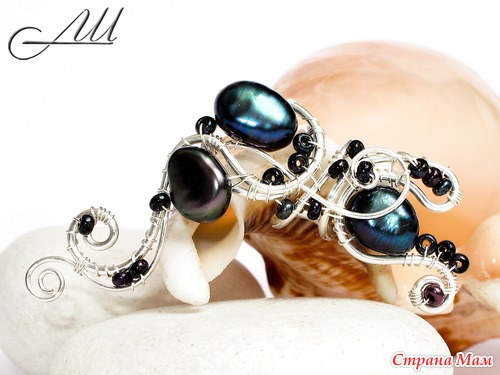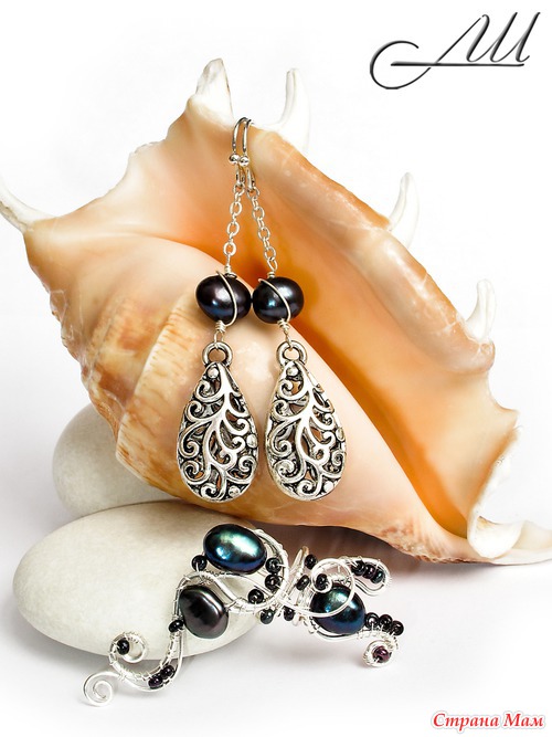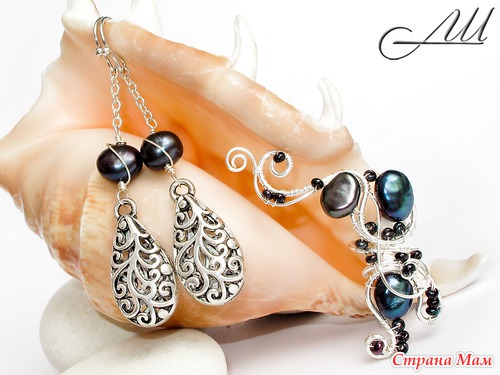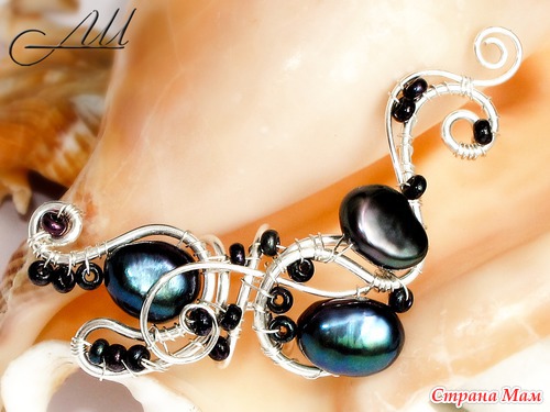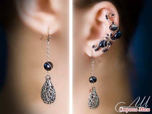 Кафф на левое ушко и пара серег с чёрным жемчугом. Для каффа проколов не требуется. Крепится за счёт небольших скобочек, которые слегка обжимаются вокруг наружного завитка ушной раковины.