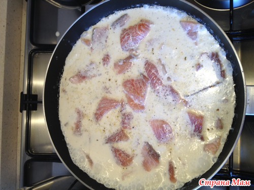 Для этого режете кусочками (размер на ваше усмотрение) рыбу, выкладываете на разогретую сковороду с небольшим количеством оливкового масла. Не дожидаясь пока рыба обжарится, примерно через минуту выливаете примерно 200 мл сливок, доводите их до легкого кипения, добавляете перец и тертый сыр.