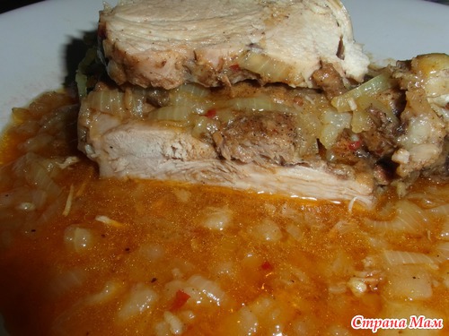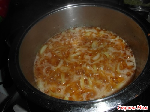 -готовое мясо выкладываем, а в оставшееся навар высыпаем лук (чем больше, тем лучше)