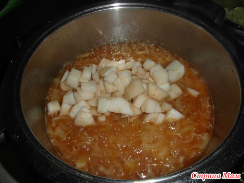 -через 5-7 мин томления лука, добавляем очищенные груши