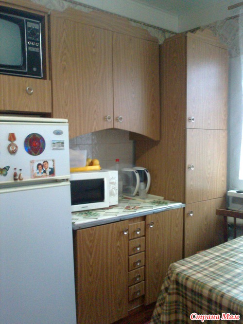Наша кухня. Вся мебель сделана его руками. С правой стороны от мойки находится шкаф-сундук для кастрюль. Над вытяжкой и колонкой висит просто панель, которая закрывает вытяжные трубы. Справа над холодильником виден телевизор ретро. Из него муж собирается сделать бар (будет вытаскивать кинескоп и оборудовать под бар).