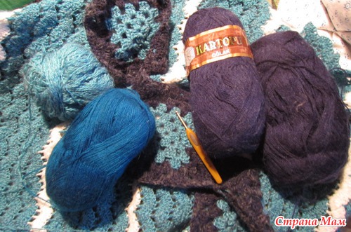 - четыре мотка KARTOPU - мохер+ акрил -два темно синих, один грязно синий. (остатки от пледа, который невестке вязала на прошлый Новый год.) и один цвета морской волны.