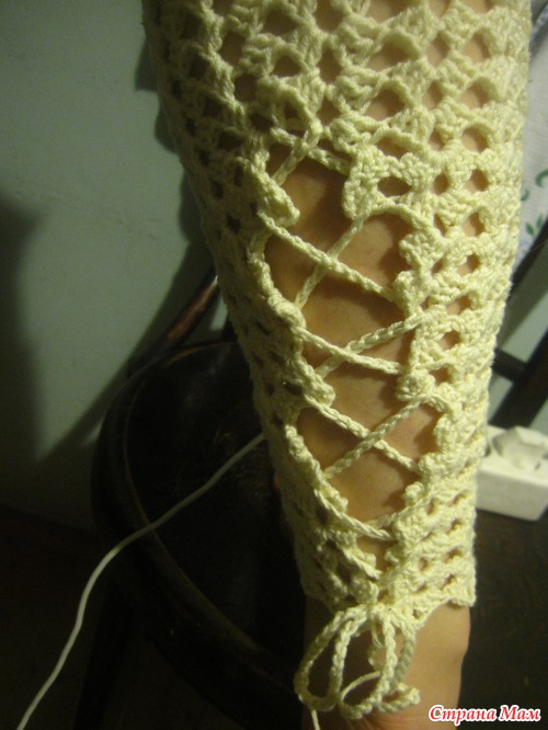 Связала я пока что одну гетру (или как её правильно назвать в единственном числе?). Вязать прямую не хочу, хочется, чтобы аккуратно ножку облегала. Для этого решила связать часть по кругу, а дальше сделать разрез, в который вдену шнурок для завязывания.