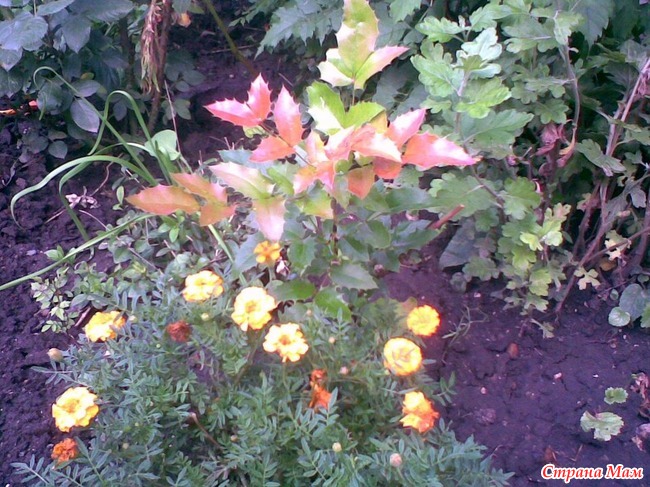 Магония падуболистная. Вечнозеленый кустарник до 1,5 м высотой. Интересен крупными кожистыми листьями, при распускании красноватыми, летом – темно-зелеными, осенью – красновато-золотисто-бронзовыми, особенно на солнечных местах. Листочки сложного листа по форме напоминают листья падуба. Цветет с начала мая и в течение месяца, иногда зацветает вторично в октябре. Темно-синие с сизым налетом, съедобные, кисло-сладкие плоды созревают в начале августа, придавая кустарнику неповторимое своеобразие. Перекрестноопыляемое растение. Лучшие формы и сорта: ’Aurеа’ (золотистые листья), ’Juglandifolia’ (орехолистная форма).