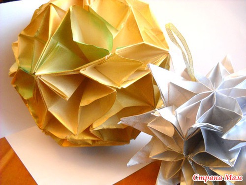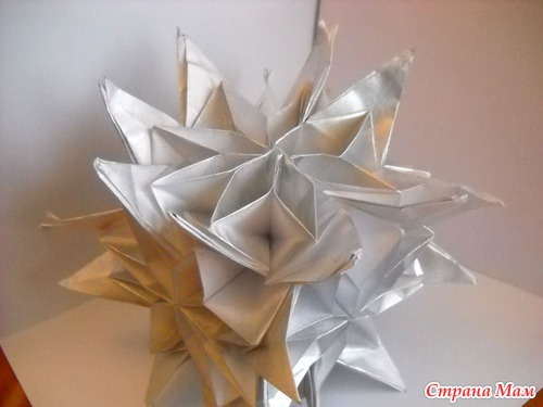 Сделала еще кусудаму. Простой модуль, но при склеивании всей конструкции испытала трудности. Модули никак не хотели склеиваться. Надо клей хороший использовать или специальные зажимы, чтобы модули не распадались. Пришлось ниточками сшивать.