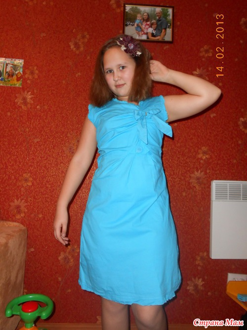 что они там есть. Сделаны очень низко, просто для прикола, для красоты--язык не поворачивается сказать, и зачем столько ткани внутри карманов, которые собираются пучком и торчат по бокам. Украшение отпорола полностью и сделала бант. Хотя вообще без ничего и то лучше! Вот что получилось:Платье №378 заказала размер 36, другие были заняты, думала из-за трикотажной ткани в принципе на дочь подойдёт, в школу ходить, но ошиблась. Само платье очень классное