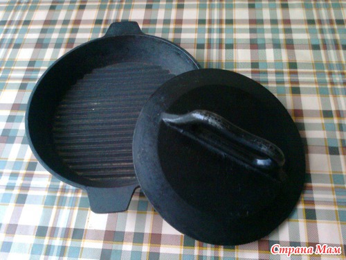 Когда у меня ещё не было такой сковороды, я жарила цыплят-табака на простой сковороде, а гнётом мне служила кастрюля с водой.