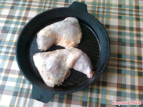 Окорочок солим, перчим, укладываем в сковороду с маслом и ставим на огонь. Придавить крышкой. Жарится окорочок 20-25 минут (10-12 минут на одной стороне, столько же на другой).