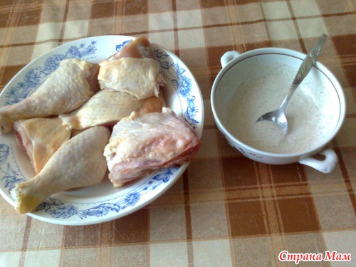 Окорочок разрезать на два - три куска. Приготовить соус: майонез, соль, перец.