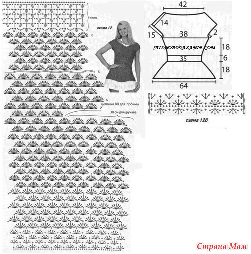 Провязав кокетку высотой 14 см, разделите вязание кофточки на полочку, спинку и рукава. Для пройм наберите цепочки ВП нужной длины и вяжите спинку и полочку единым полотном по кругу, руководствуясь схемой 12. Провяжите часть полотна для груди ровно, без убавок (часть АБ на схеме). Затем начните делать убавки, уменьшая количество столбиков в «веерках» (часть БВ на схеме).