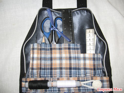 ... в органайзер для рукодельницы, где надежно уместились распарыватель, карандашик, сантиметр, ножнички, линейка, нитки, иголки-булавки. А в большой карман можно положить блокнотик и еще чего душа пожелает