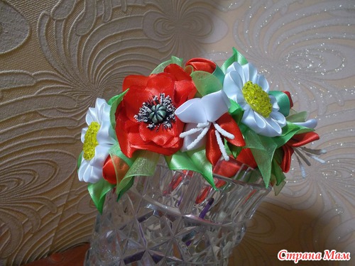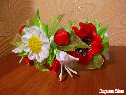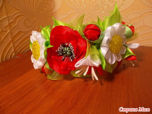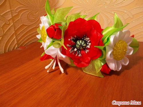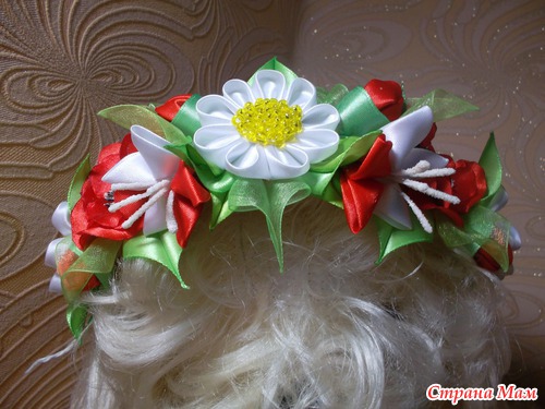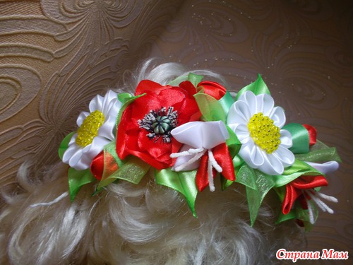 Вот такой ободок мне заказали в виде веночка только чтобы был бело-красный, если честно то сама не знала что получится, ну вот выставляю на ваш суд, думаю что не плохо получилось