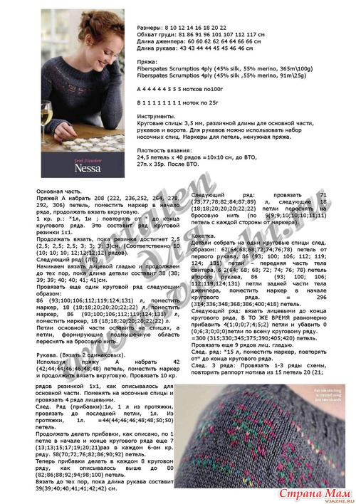 Инструменты: Круговые спицы 3,5 мм, различной длины для основной части, рукавов и ворота. Для рукавов можно использовать набор носочных спиц. Маркеры для петель, ненужная пряжа.