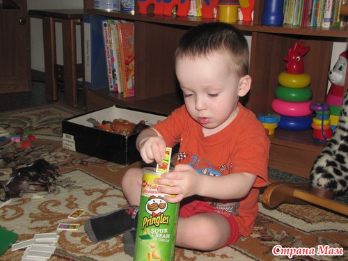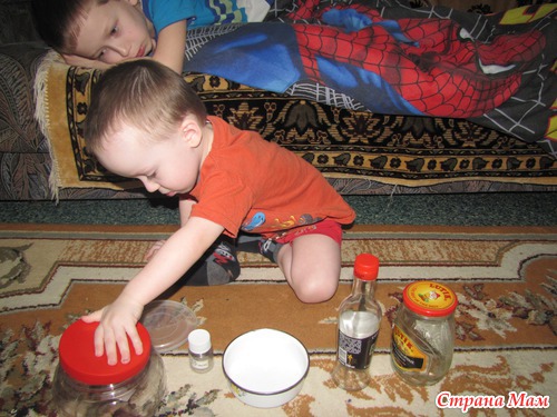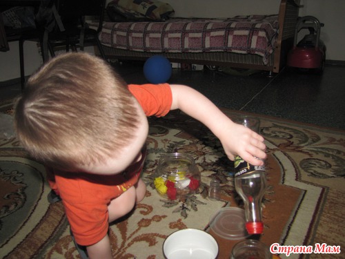 Предложила Сашке несколько разных баночек и бутылочек. Нужно было правильную крышку найти. И почему я решила, что это задание может какие-то затруднения вызвать?