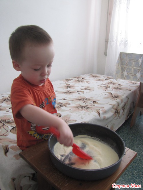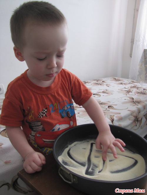 Сашка рисовал каракули и комментировал: Ку! (круг), Бу бэ (буква б), во др-др (вот машина). Потом пошел дальше, принес лопатку и стал ею манку загребать