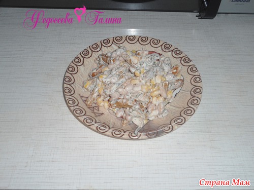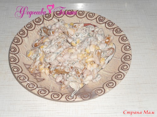 сухарики высопать в салатник. добавить туда кукурузу и фасоль. сделать из чеснока майонеза сметаны укропа заправку и вылить в салат посолить и готово