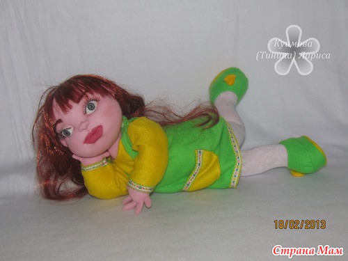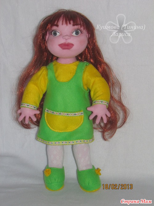 Вот сегодня закончила новую девочку ЗЛАТУ. Рост 48 см, выполнена из трикотажа, внутри каркасик, может сгибать, двигать ножками-ручками, наклонять, поднимать голову, наклоняться. Можно делать разные прически. Кофточка, сарафанчик и топотульки сшиты из мяконького флиса. Очень милая, озорная девчонка. Прошу любить и жаловать.