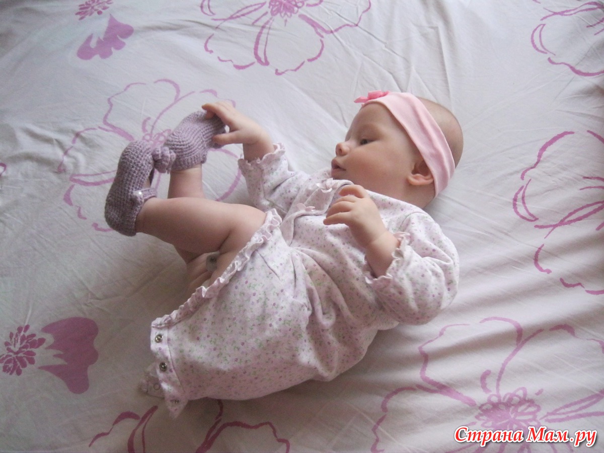 вот и лето пролетело как один день... А вспоминаются моменты когда в 40 градусную погоду хотелось прихода холодов. Так вот пока таковые не за горами, нужно позаботиться о тепле ножек своего чада. вот этим я и занялась и за 2 денька связала дочурке тапочки. Жаль только что ножка быстро растет, до зимы уже маленькими станут