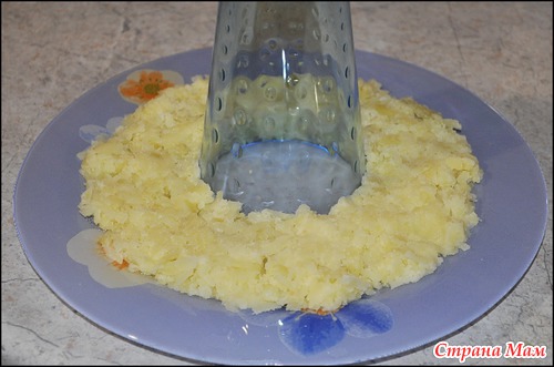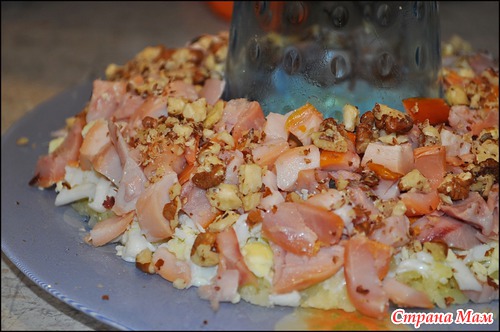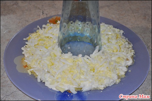 Салат готовиться слоями. Каждый из которых смазывается майонезом. На середину блюда, в котором собираемся подавать салат, поставить стаканчик. Слои салата выкладывать вокруг стаканчика, чтобы получить форму браслета.1-ый: отварной картофель.