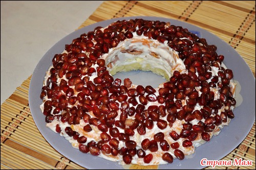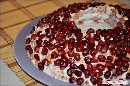 Сверху промазываем майонезом и выкладываем зерна граната.