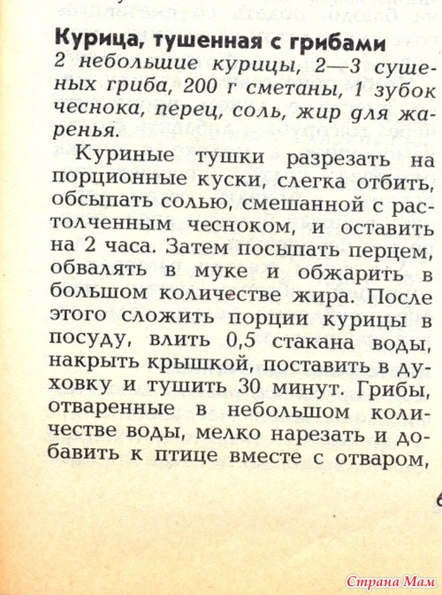 Я готовлю по этому рецепту без грибов, в духовке, в глиняной кастрюле, вкусно. И обжариваю чуть-чуть на масле растительном. Готовлю, в основном, бедра куринные. Читать полностью