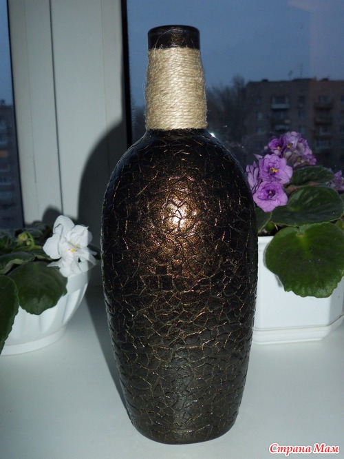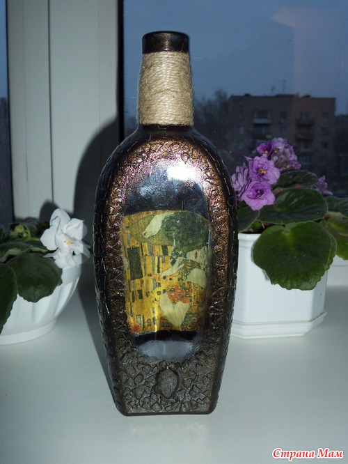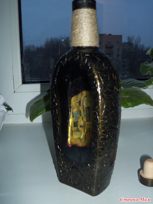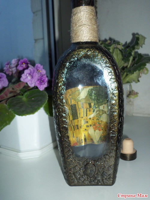 Выполнена в технике обратный декупаж и кракелюр яичной скорлупой, тонировала золотом)) На фото не очень(( получилось, т. к вспышка дает блик на бутылке