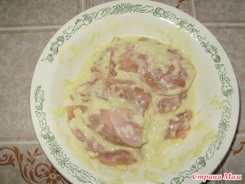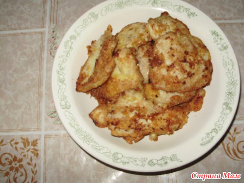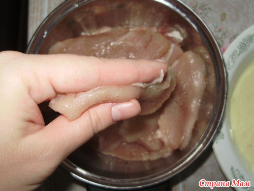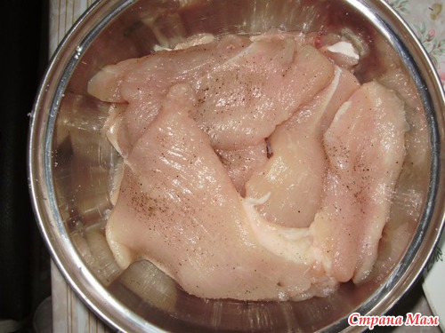 Я брала филе курицы, вдоль разрезала на тонкие пласты, посолила, поперчила каждый кусочек